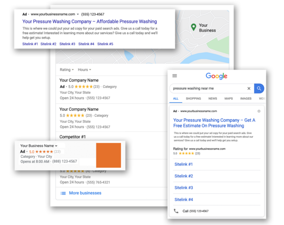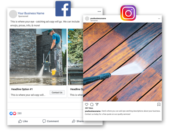 Utilizing Facebook’s advertising platform, we can tap into many different audiences of people on Facebook and Instagram. Social Media advertising has the unique ability to not only target the right Pressure Washing customer in the area of your choice, but it also allows social interaction between a customer and the Pressure Washing Business. People can comment, like, and share your post with other friends and family. Facebook also has the ability to use video and image ads to engage potential customers. Your customers are Facebook and Instagram, and we’ll use these platforms to reach them directly with your messaging.